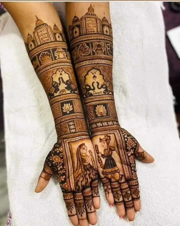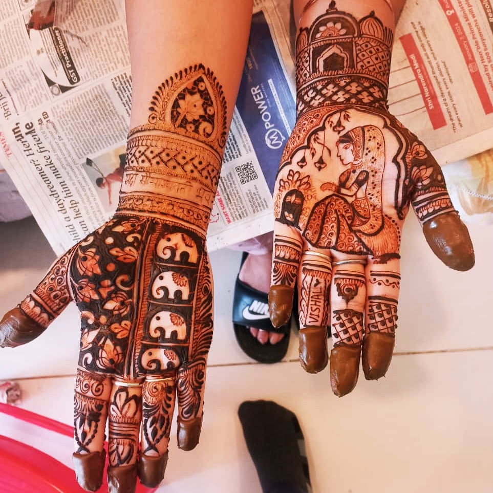 Bridal mehndi, or henna designs, are often applied in India. Mehndi, also called a henna tattoo, is a traditional temporary skin decoration using henna that is often applied for weddings in India.